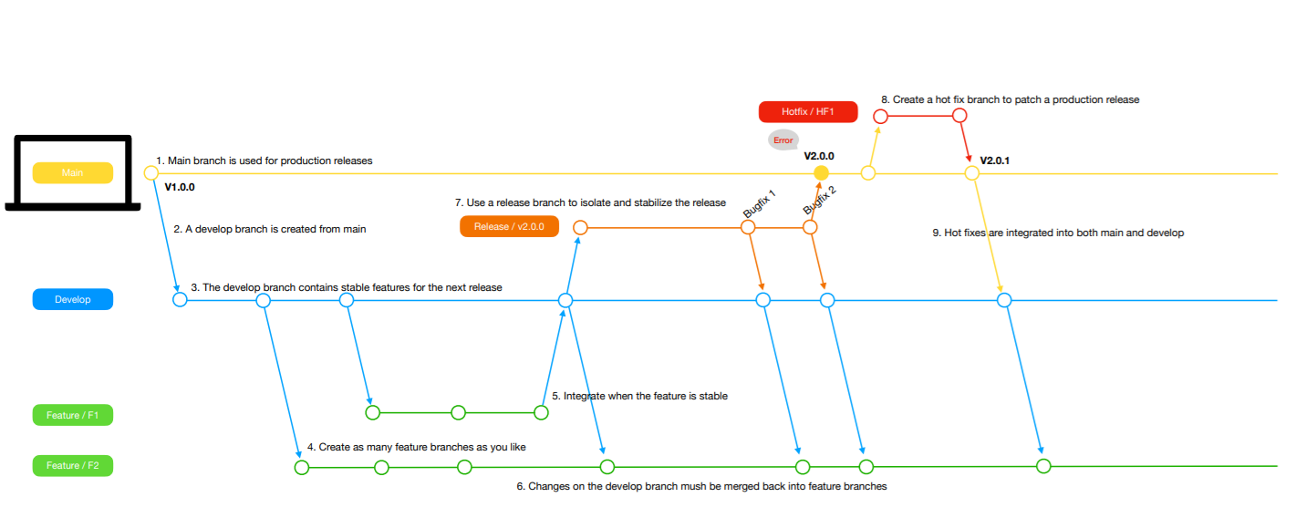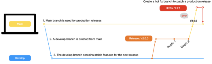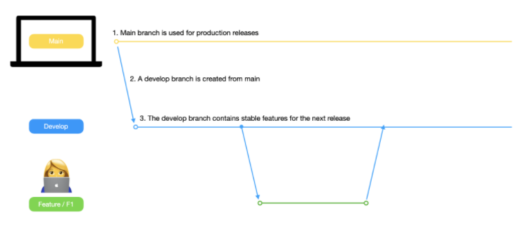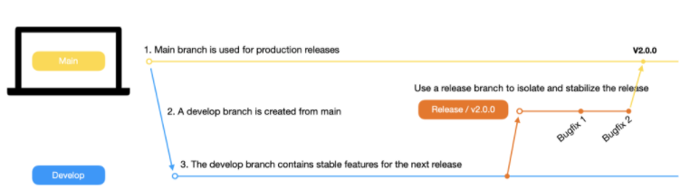 : main은 실제로 상품 단계에서 구동되고 있는 단계의 코드들이 모여있다. (production release에 사용되는 branch)