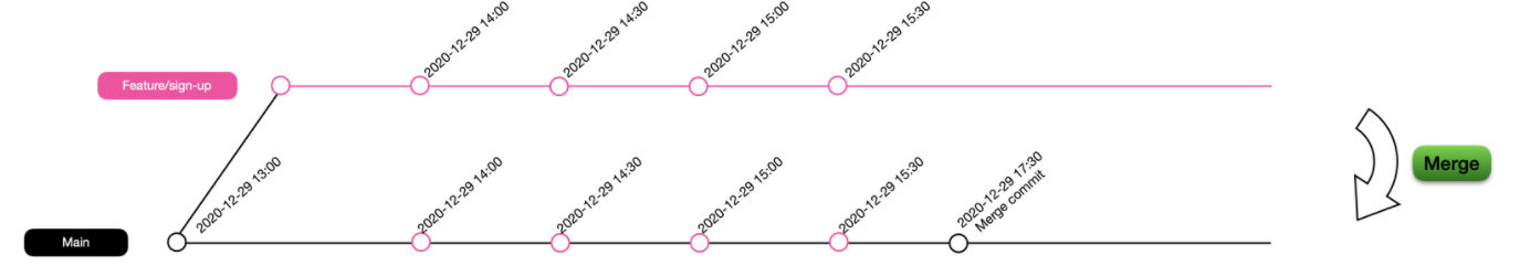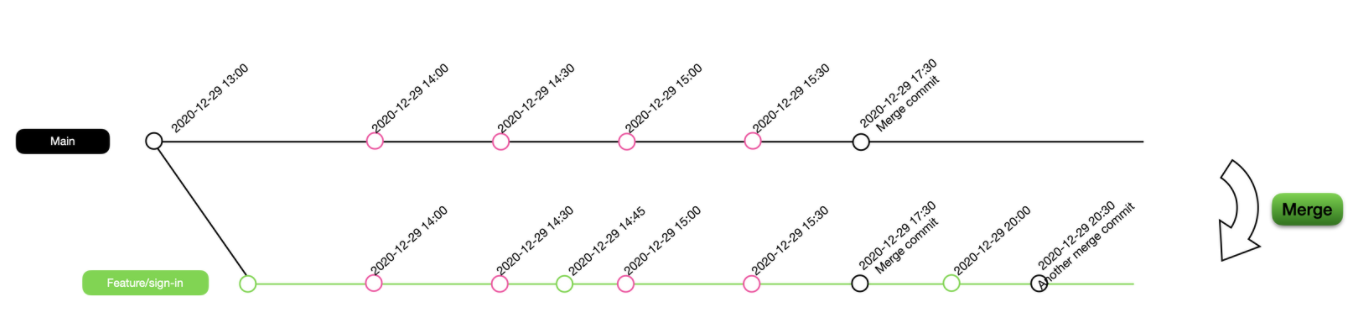 2. feature/sign-in의 연두색 commit 사이로 sign-up의 분홍색과 main의 검정 commit이 들어갔다.