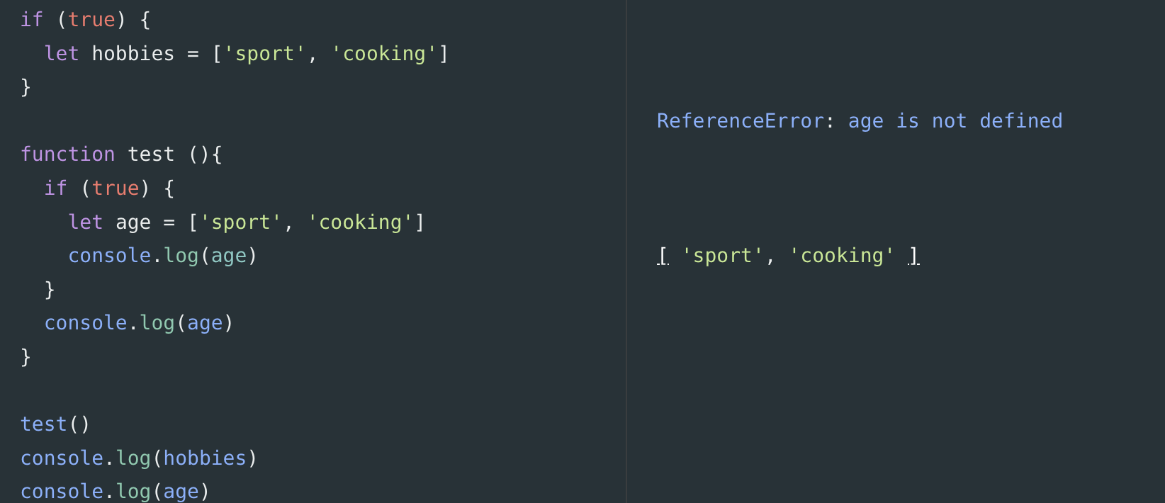 함수 안에서 선언한 age를 그 블록 내부(중괄호 안)에서만 콘솔이 찍히고, 그 외에는 모두 에러가 나는 것을 볼 수 있다.
