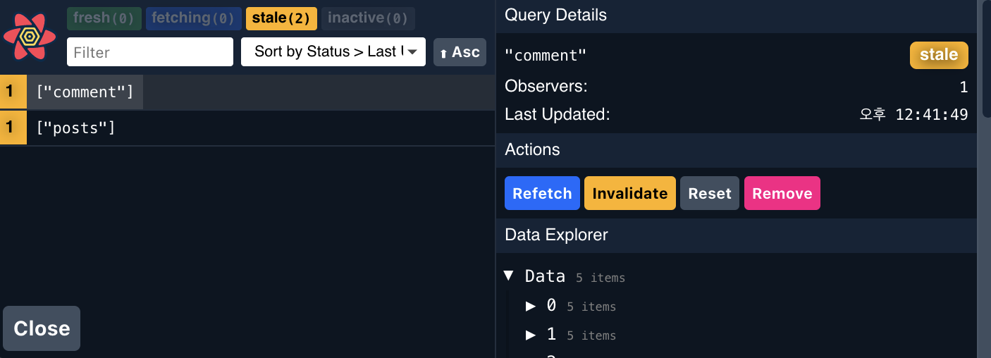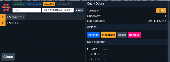 - 개발자 도구는 앱에 추가할 수 있는 컴포넌트로 개발중인 모든 쿼리의 상태를 표시해 준다.