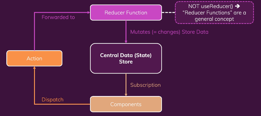 1. component가 특정 action을 trigger ( action은 단순 자바스크립트 객체 - reducer가 수행하는 작업의 종류를 설명 )