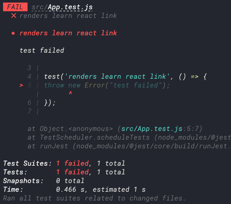 App.js에서 Learn React 텍스트를 바꿔서 test를 실행하면 FAIL
