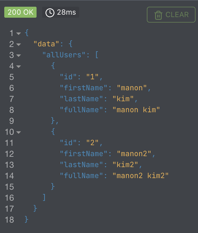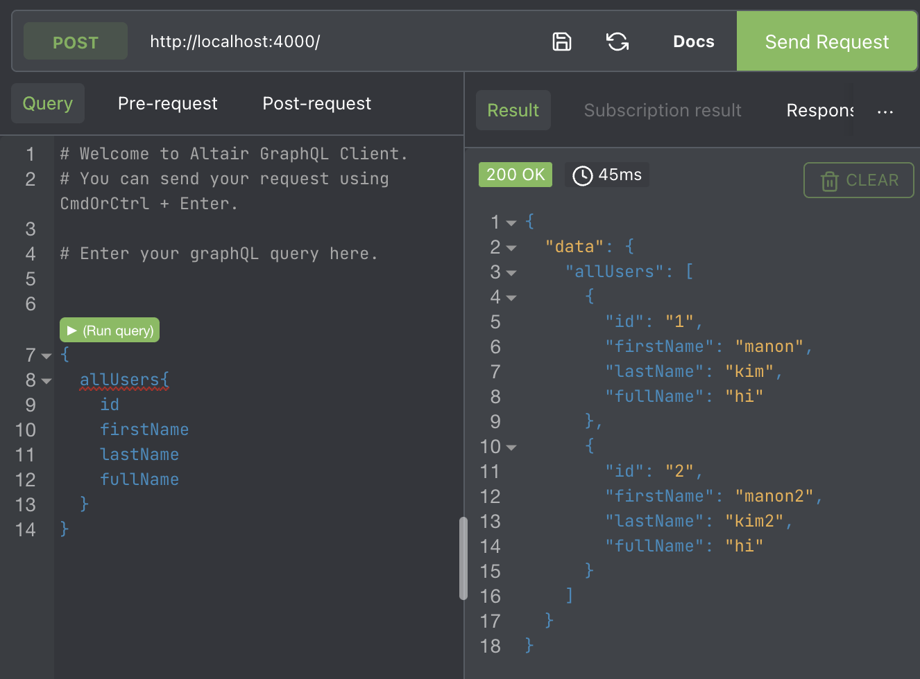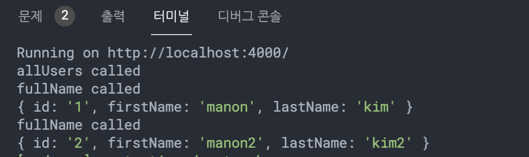 2. 호출해야하나느 user가 2개가 있어서 graphql은 User를 두번 찾는다. (consoledp 'fullname called'가 두번찍힘)